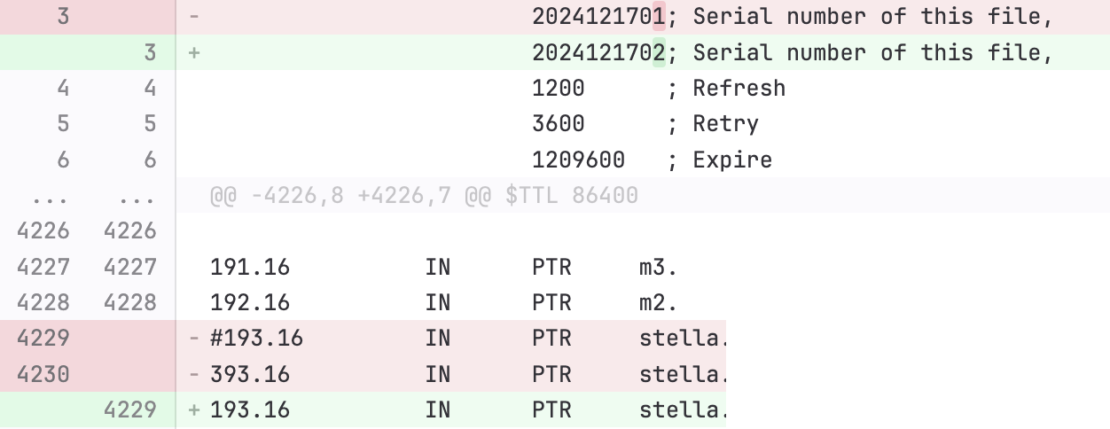 Now we can check that our changes are OK. Line 3 shows that the old serial number 2024121701 was removed and that serial number 2024121702 was added, so this checks out. Lines 4229 and 4230 show that a commented out entry was removed as well as a line with an invalid value in the last octet (393), both for the host stella. The last line shows a new line was added for stella with valid values, so overall the last commit is valid.