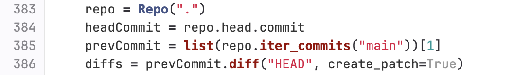 In this example we start by identify the repo we're working with in line 383 and the head (last) commit is defined in head.commit in line 384.
