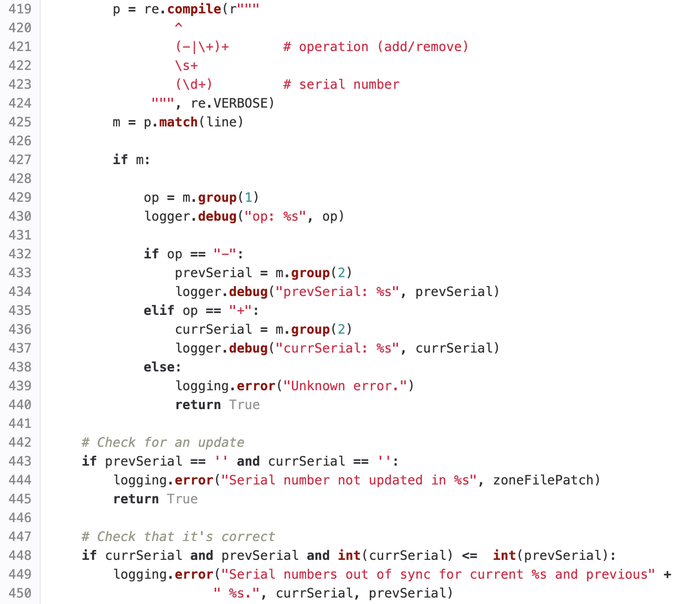 I wrote this code for DNS as part of larger tool that verifies zone files for a couple of reasons; one is to make sure I didn't make a typo or forget something simple, but the second is to prevent the named daemon from crashing on a bad zone file. The last thing we need is a non-responsive production DNS server. We push changes to DNS using a GitLab CI/CD pipeline and this script runs before pushing changes to production. This makes changes safer and allows for rapid rollback by reverting the GitLab commit.